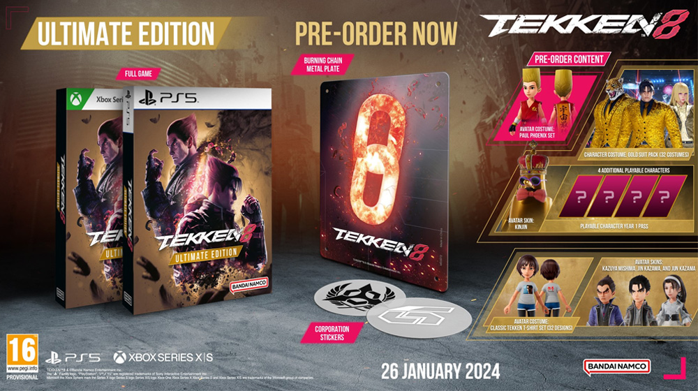 TEKKEN 8 nastavlja tragičnu sagu o Mišiminoj krvnoj liniji. Nakon što je pobedio svog oca, Heihachi Mishimu, Kazuia nastavlja svoje osvajanje za globalnu dominaciju, koristeći snage G korporacije za vođenje rata u svetu. Jin je primoran da se suoči sa svojom sudbinom dok se ponovo ujedinjuje sa svojom davno izgubljenom majkom i nastoji da zaustavi terorističku vladavinu svog oca Kazuje. Tekken 8 Ultimate izdanje sadrži:- igru – korporacione nalepnice- metalnu pločicu sa užarenim lancem- Paul Phoenix Avatar kostim- Kostim karaktera: Gold Suit Pack (32 kostima)- Avatar Skin KinJin- Igrivi karakter jednogodišnja propusnica (4 dodatna lika za igru)- Avatar kostim: klasični Tekken set majica (32 dizajna)- Avatar skinovi: Kazuya Mishima, Jin Kazama i Jun Kazama